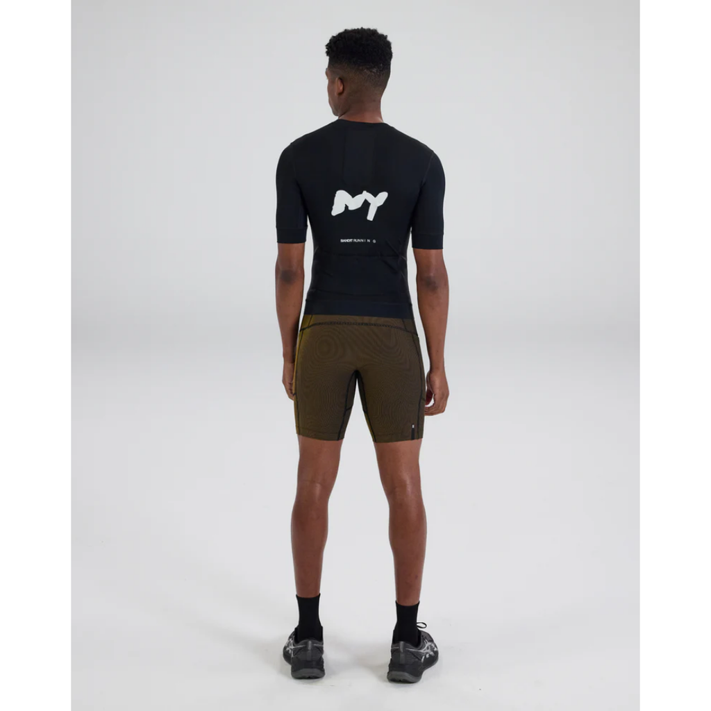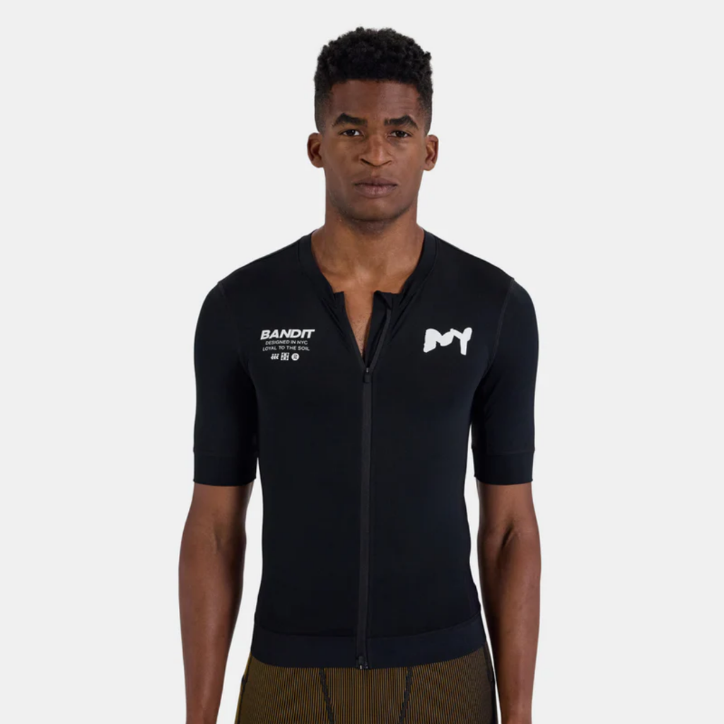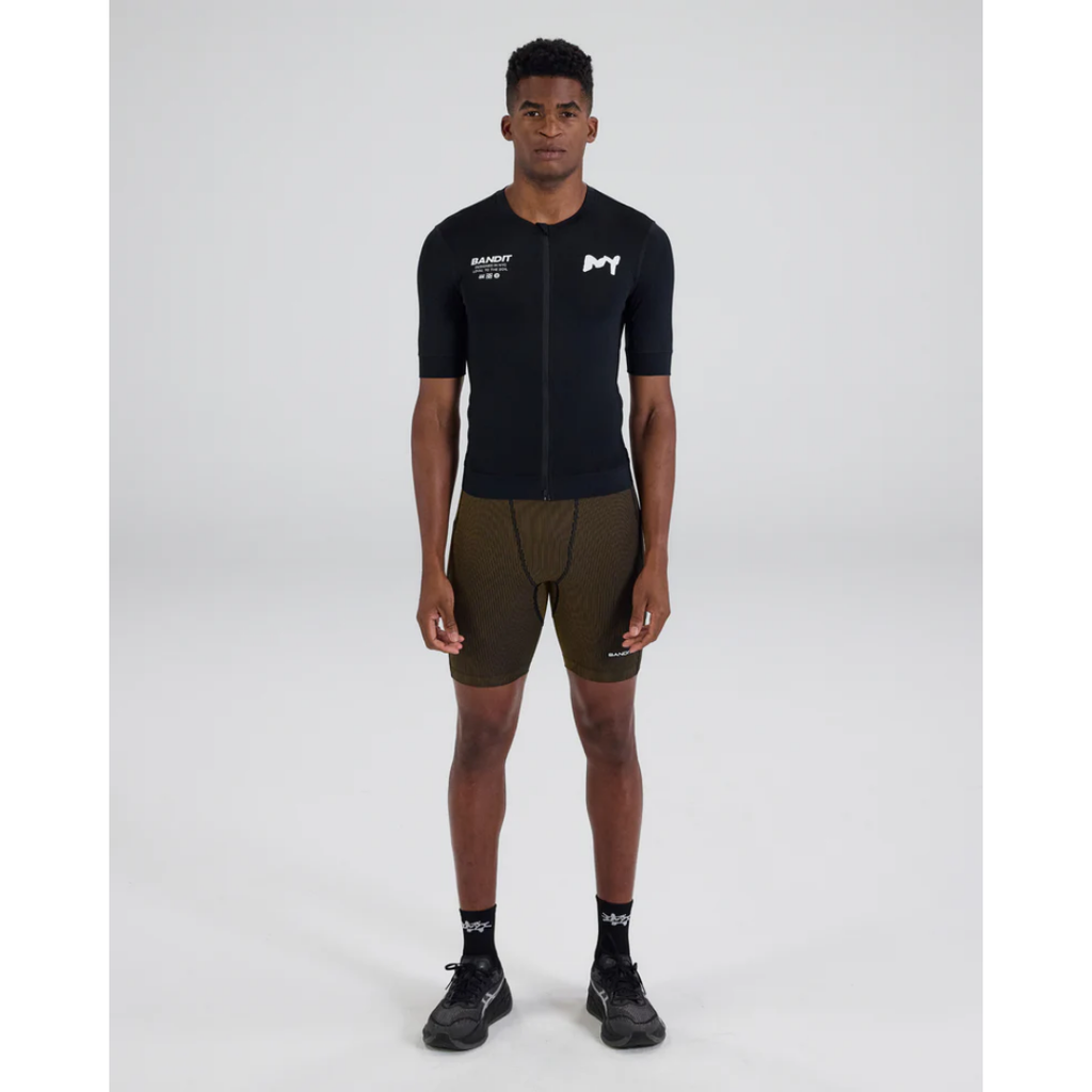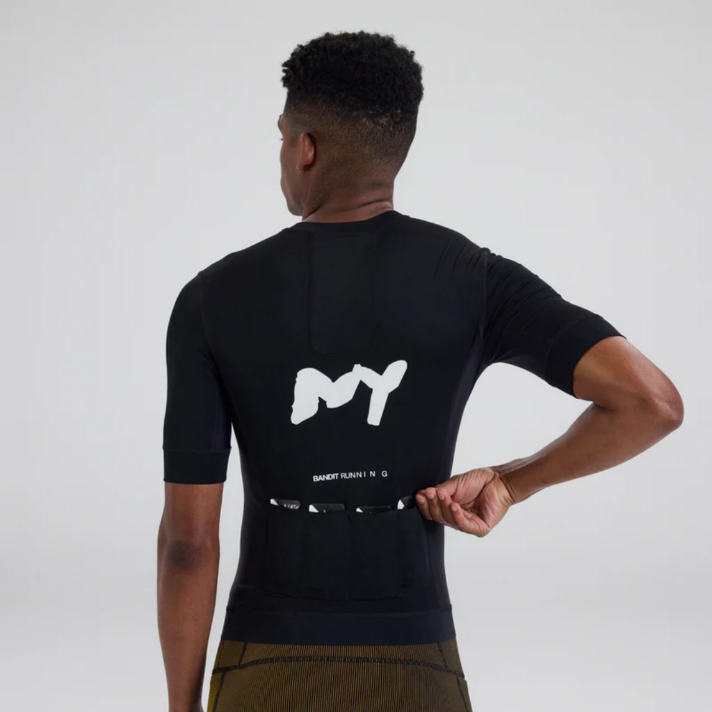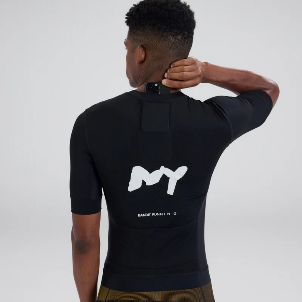 Bandit's Men's Zip Front Tee in the Ares™ performance fabric. Includes 5 total pockets: 4 gels, 1 phone. A 2-way branded zipper at center front adds additional mobility and versatility. Elastic at bottom hem with gripper detail and reflective branding at front and back body. Limited edition Fall '25 graphic. This fitted silhouette is Bandit's most versatile men's style, perfect for training and racing.