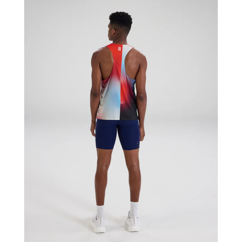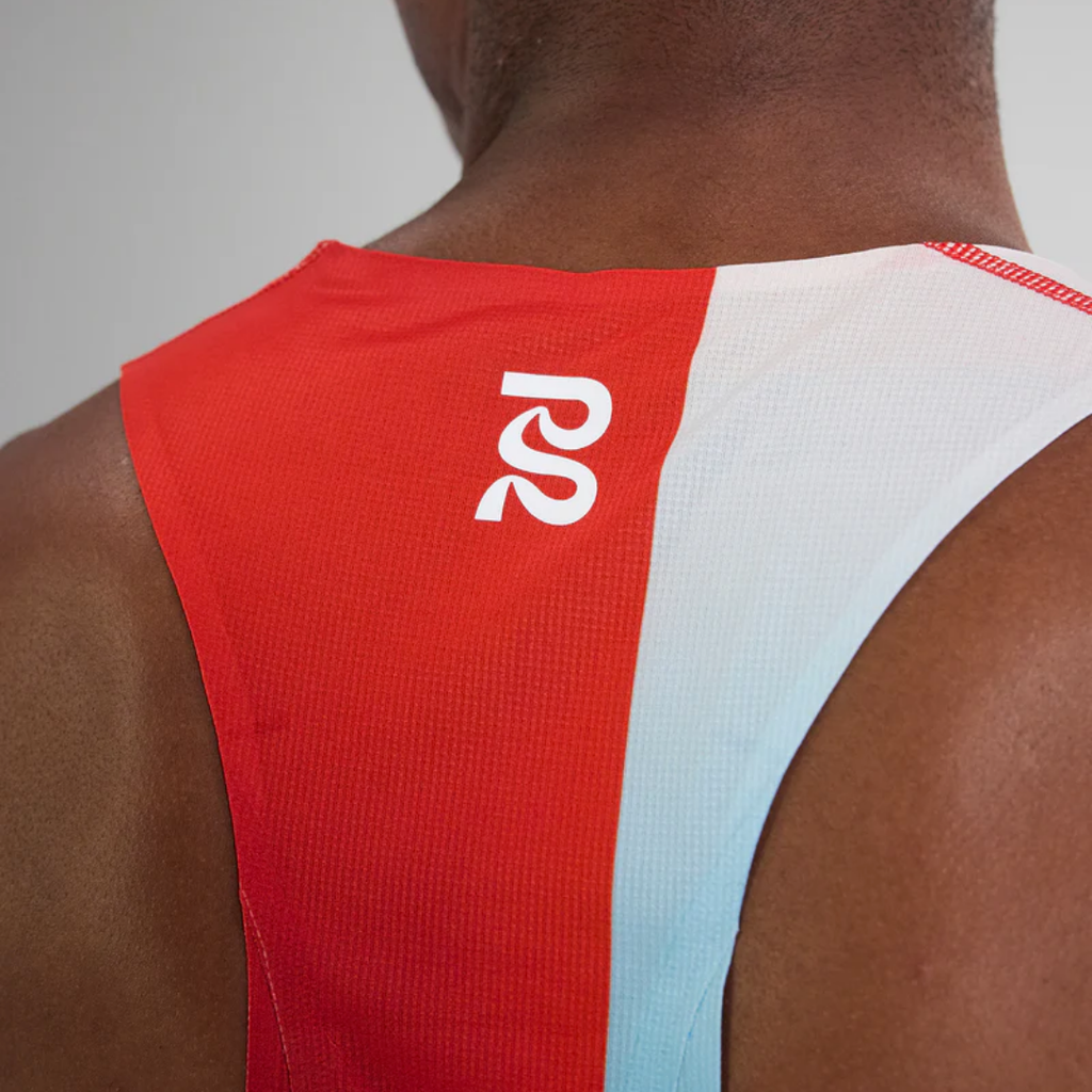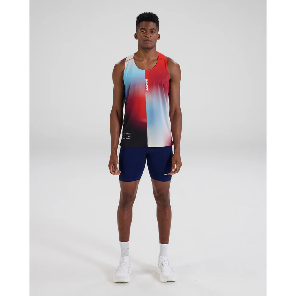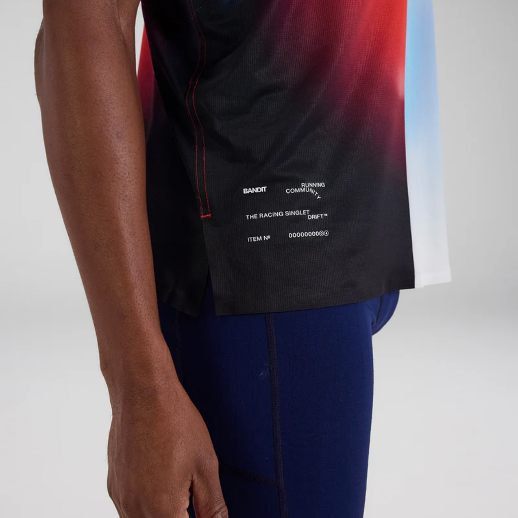 Bandit's Drift™ Racing singlet, now in limited edition prints. Details include narrow straps and racerback for unrestricted range of motion, bonded seams to prevent chafing, side slits for additional mobility, and piecing creating a sleek look. Complete with reflective graphic hits at center front, right hem for visibility. Featherweight and airy, Drift™ employs a sophisticated jacquard knit construction creating a micro-textured surface on its reverse side, strategically designed to reduce sticking. The Drift™ singlet keeps you chafe-free and cool. The ultimate racing item, engineered to seamlessly move with your body.