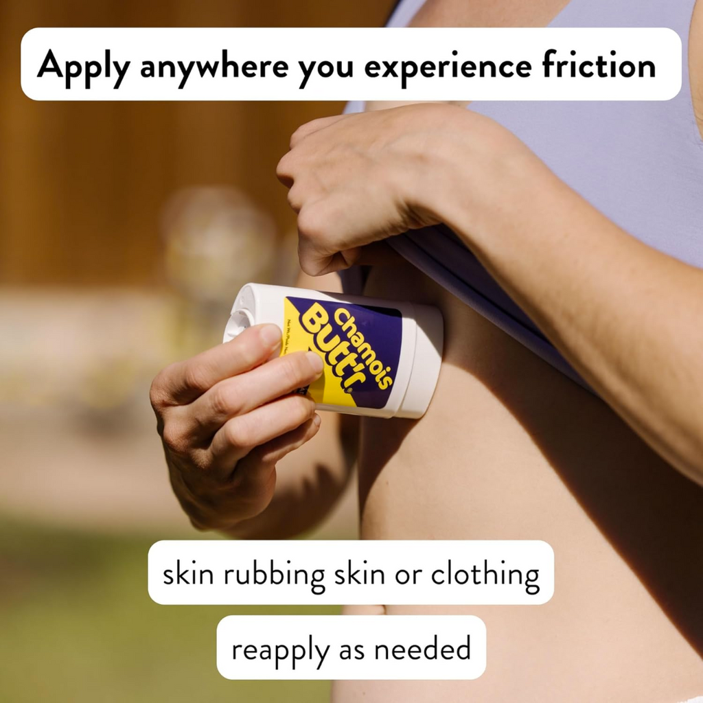 Introducing Chamois Butter GoStik solid stick skin lubricant. The 2.5 ounce dispenser allows for easy, no mess application of skin lubricant precisely to select skin areas. GoStik is excellent for swimming, running, cycling, triathlons, hiking, construction, military and more. Apply liberally to skin before activity. Apply to any skin areas that rub together or against clothing. GoStik has multiple applications for chafing prevention during any physical activity. This product is safe to use with neoprene wet suits and other technical fabrics. GoStik is fragrance free and washes off skin and clothing with soap and water. For external use only.