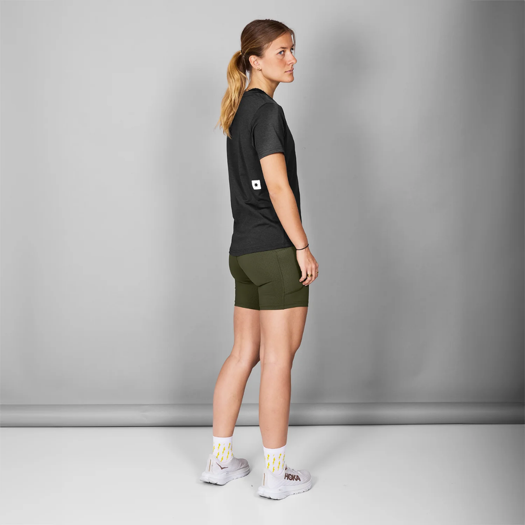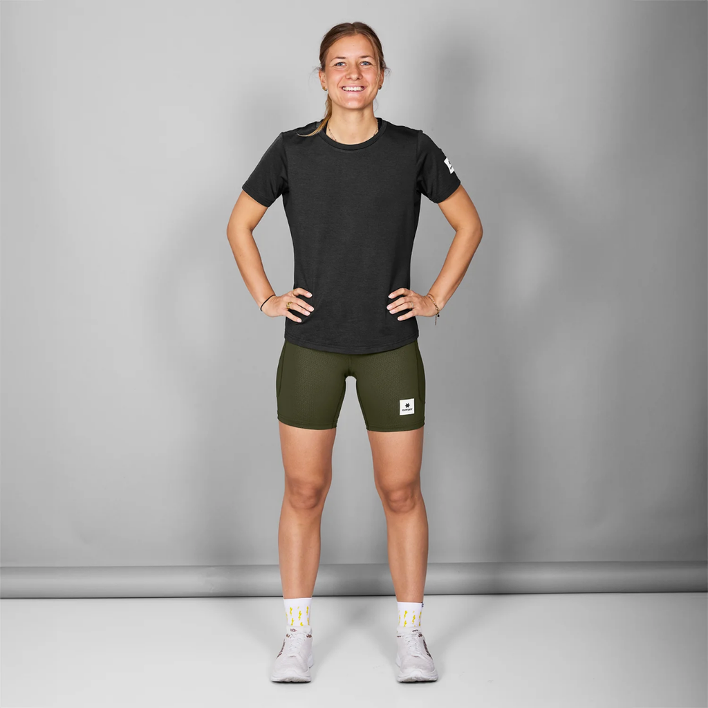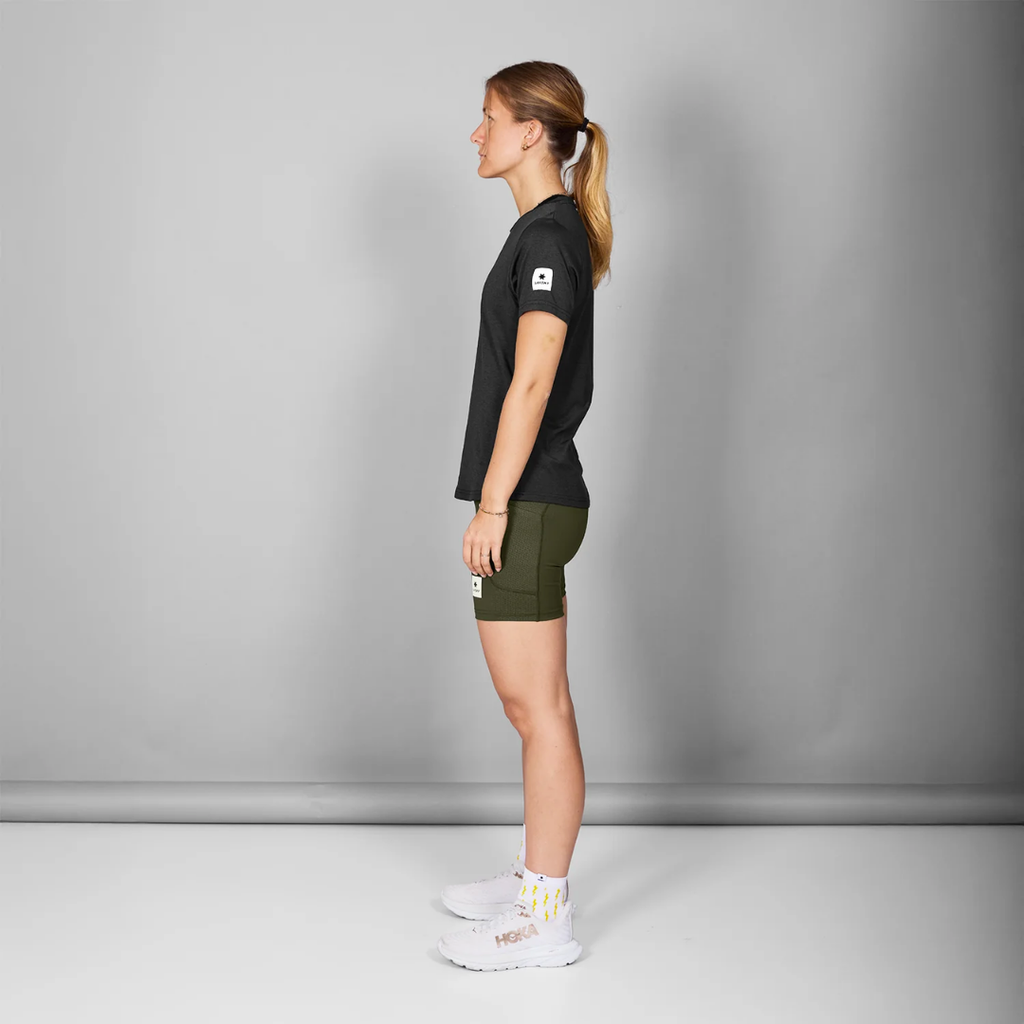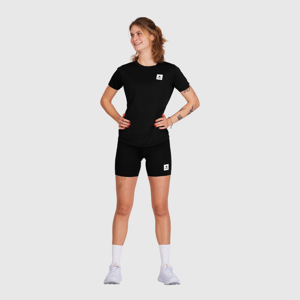 The SAYSKY women's Combat+ Short Tights 7" are a pair of short women's running tights ideal for running in the transitional season as an alternative to long tights. They have two side pockets fitting a phone and a back zip-pocket for keys or gels. The shorts have a box print logo on the thigh and a woven label on the waist.