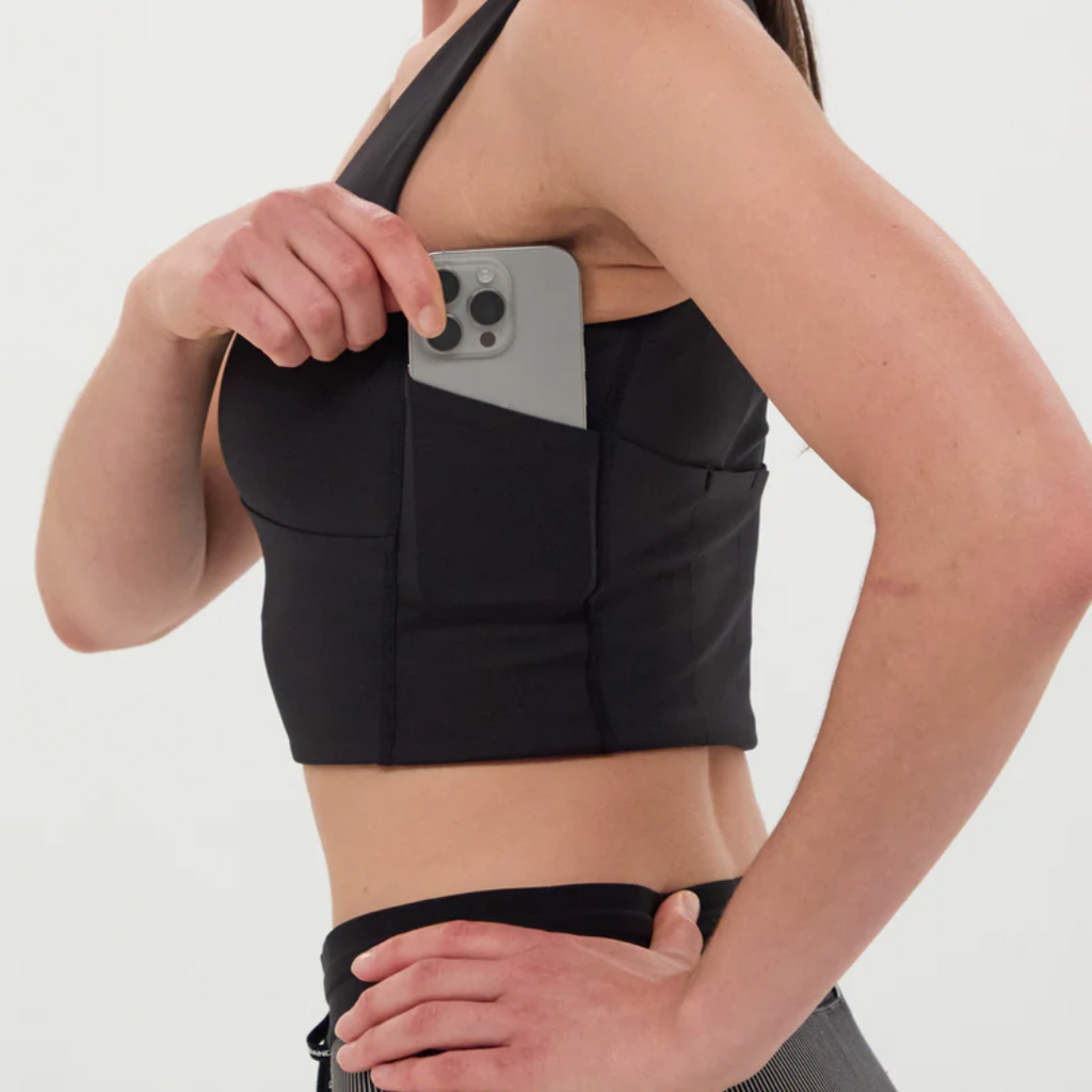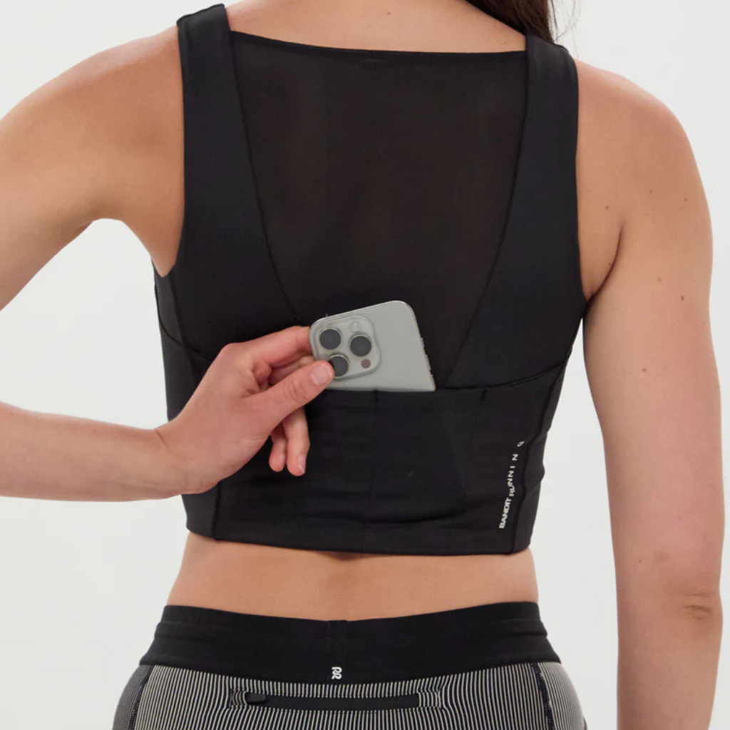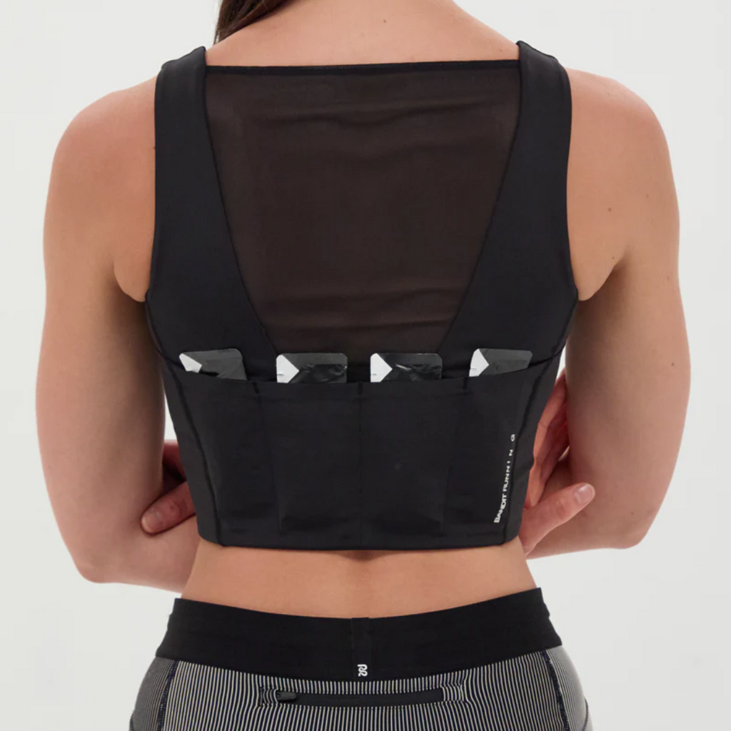 POCKETING SYSTEM. Multiple pockets, zero telling. Sweat-proof phone and gel-sized pockets all designed to disappear when you run. 4 gel, 3 phone.