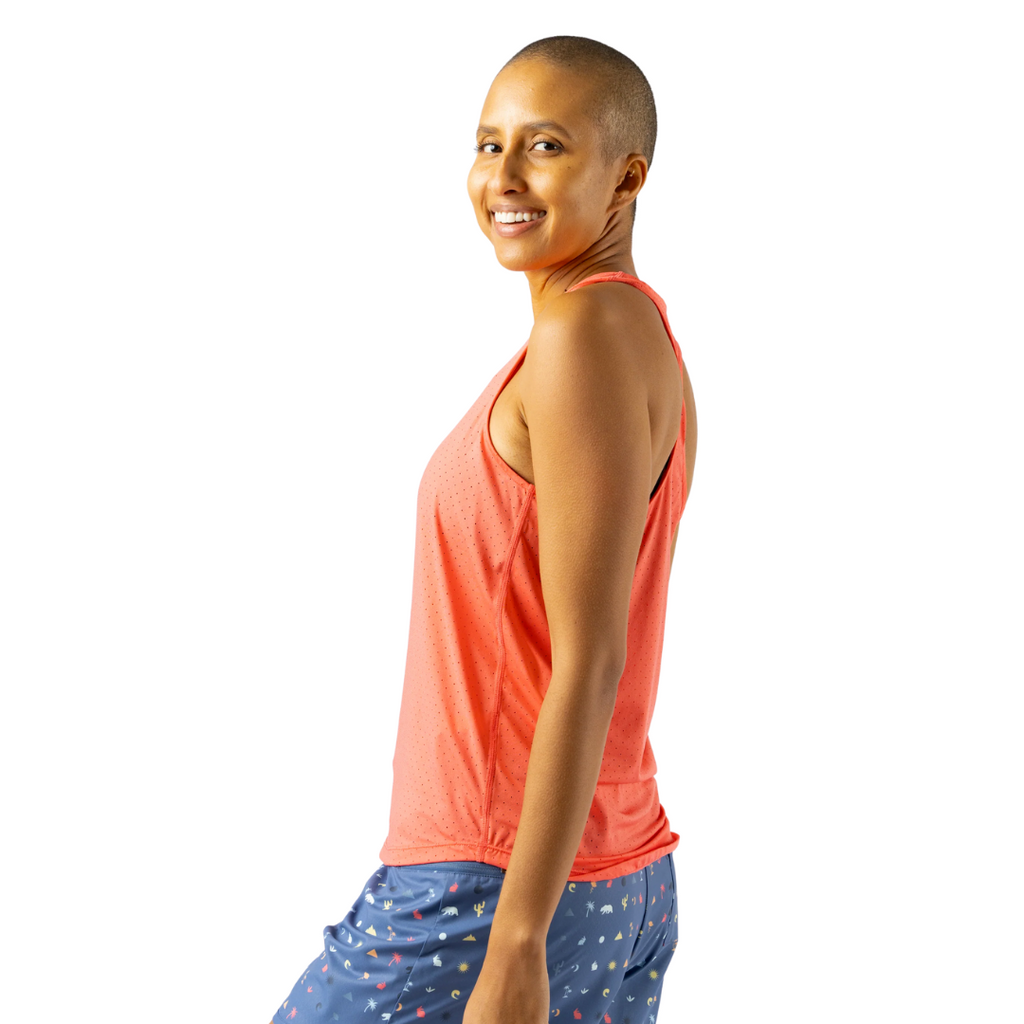 Drop into the zone. A high neckline and sculpted racerback freshen up the basic tank. With perfs all over, it’s extra light and breathable. Plus, sustainable nylon made from recycled coffee grounds dries quickly, controls odor, and keeps you cool for total comfort.