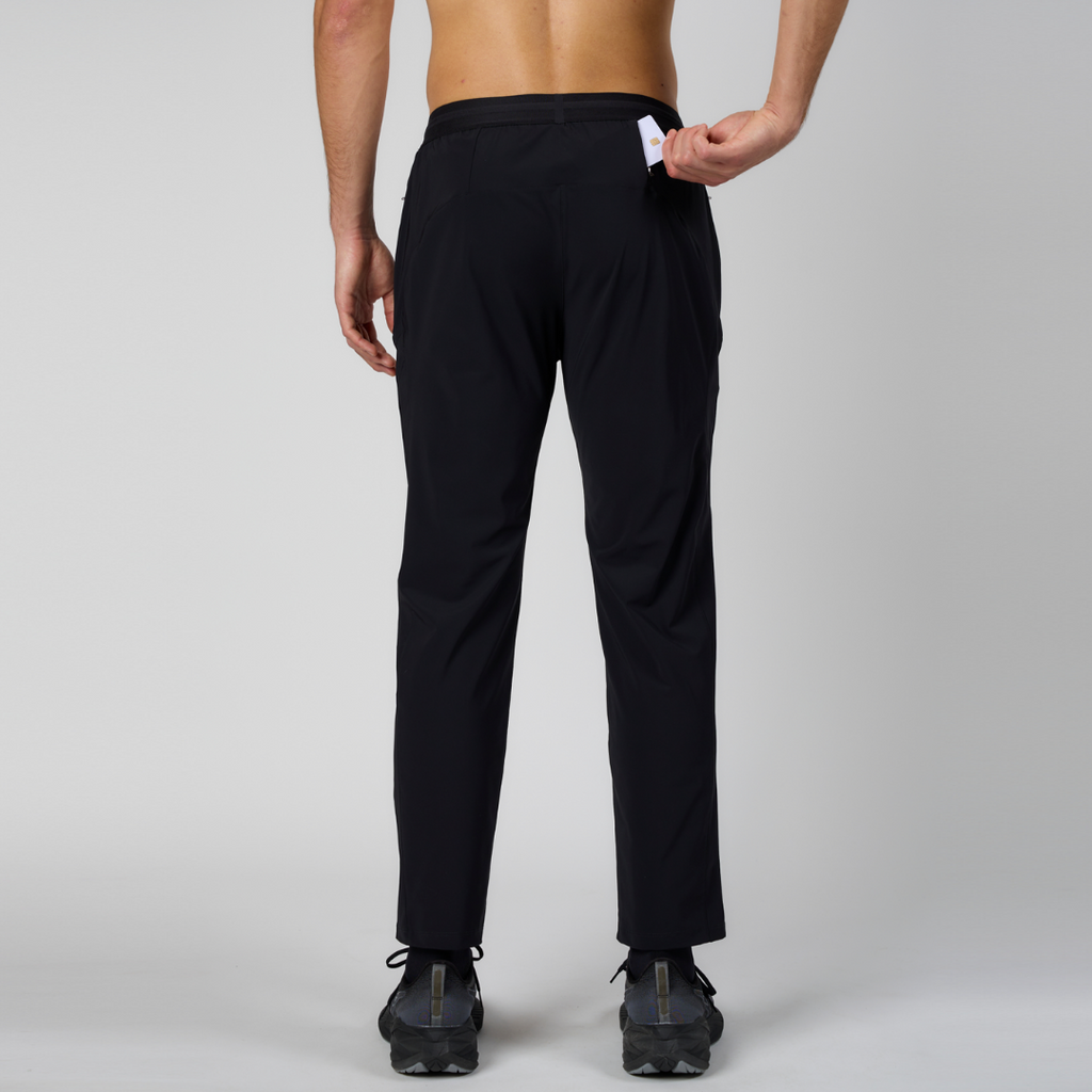 A clean, minimal take on a classic jogger pant, cut in a 4-way stretch Italian fabric. This slim tapered silhouette is perfect to wear on its own or over your shorts on the chillier spring days. Signature exposed elastic waistband and branded drawstring finished with contrast Taxi bartacks. Front zipper pockets, along with a third back zipper pocket, ensure secure storage for any training run, on the track or to the grocery store. Zipper detail on hem adds an additional layer of functionality.