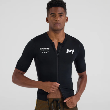 Bandit's Men's Zip Front Tee in the Ares™ performance fabric. Includes 5 total pockets: 4 gels, 1 phone. A 2-way branded zipper at center front adds additional mobility and versatility. Elastic at bottom hem with gripper detail and reflective branding at front and back body. Limited edition Fall '25 graphic. This fitted silhouette is Bandit's most versatile men's style, perfect for training and racing.