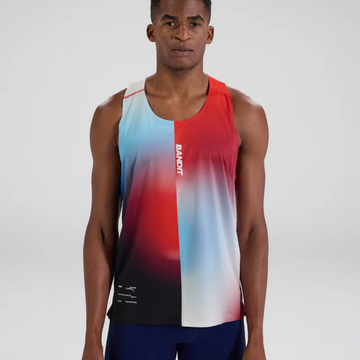Bandit's Drift™ Racing singlet, now in limited edition prints. Details include narrow straps and racerback for unrestricted range of motion, bonded seams to prevent chafing, side slits for additional mobility, and piecing creating a sleek look. Complete with reflective graphic hits at center front, right hem for visibility. Featherweight and airy, Drift™ employs a sophisticated jacquard knit construction creating a micro-textured surface on its reverse side, strategically designed to reduce sticking. The Drift™ singlet keeps you chafe-free and cool. The ultimate racing item, engineered to seamlessly move with your body.