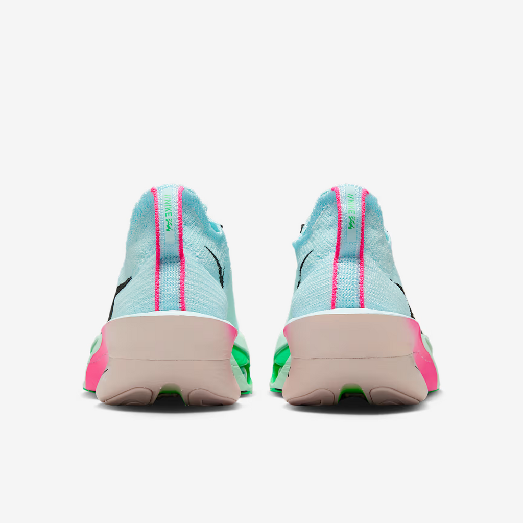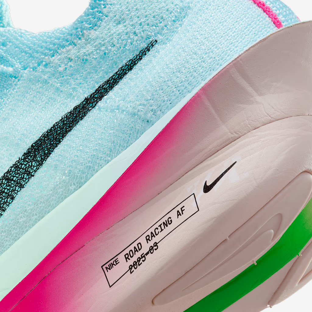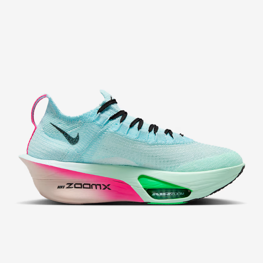 The Alphafly 3 is our lightest Alphafly ever, featuring a slightly wider carbon-fibre plate for increased stability, a fully connected ZoomX foam midsole for smoother transitions and an all-new AtomKnit upper designed for improved multi-directional containment and breathability.